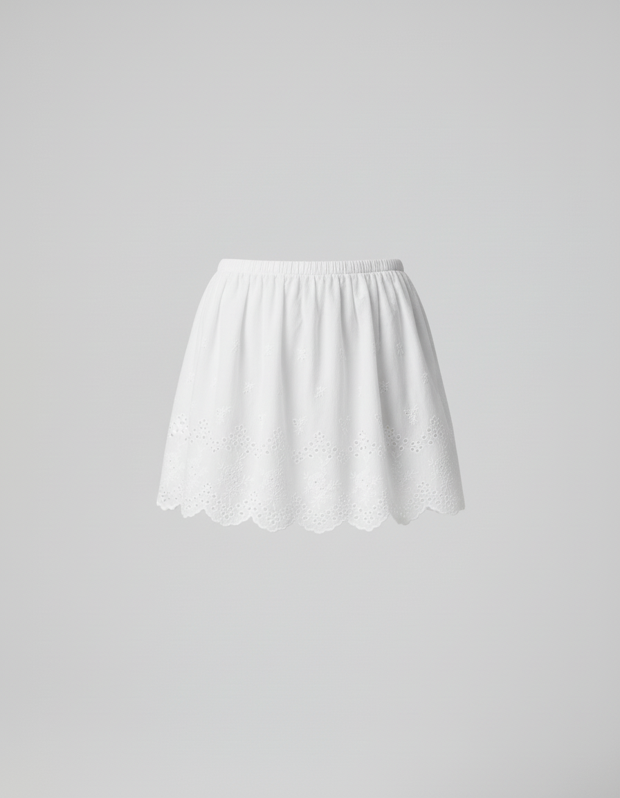 Cette jupe courte blanche présente une taille élastiquée et un ourlet festonné. Le tissu est orné de motifs perforés.