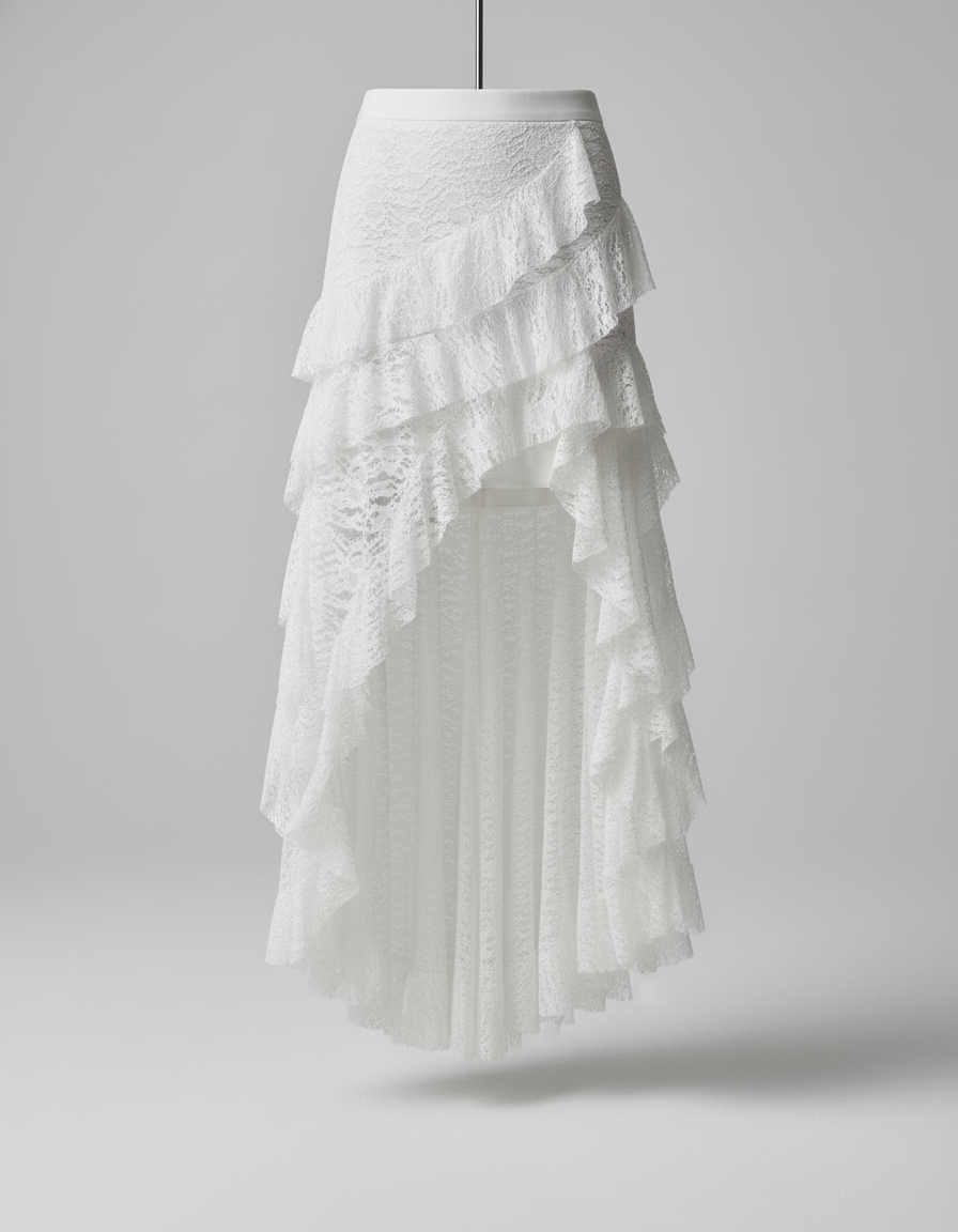 Cette jupe est confectionnée en dentelle blanche et présente plusieurs volants superposés. Elle est dotée d'un ourlet asymétrique, plus court à l'avant et plus long à l'arrière.