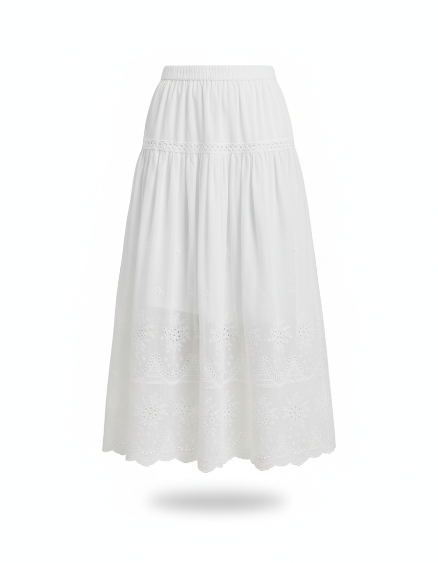 Cette jupe présente une coupe longue et évasée avec des motifs de broderie anglaise sur le bas. Elle est de couleur blanche et confectionnée dans un tissu fluide.