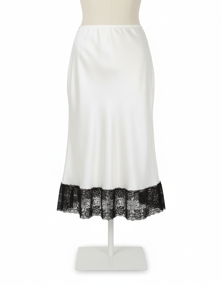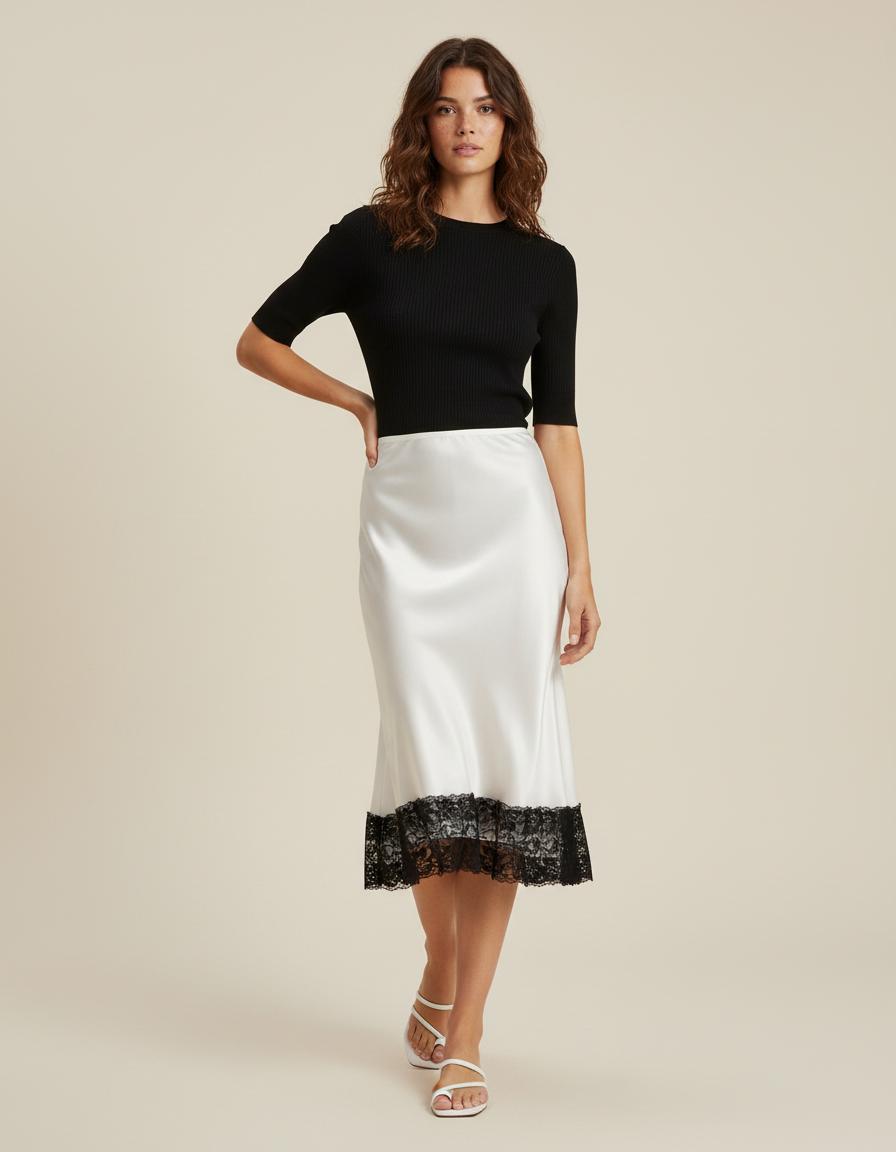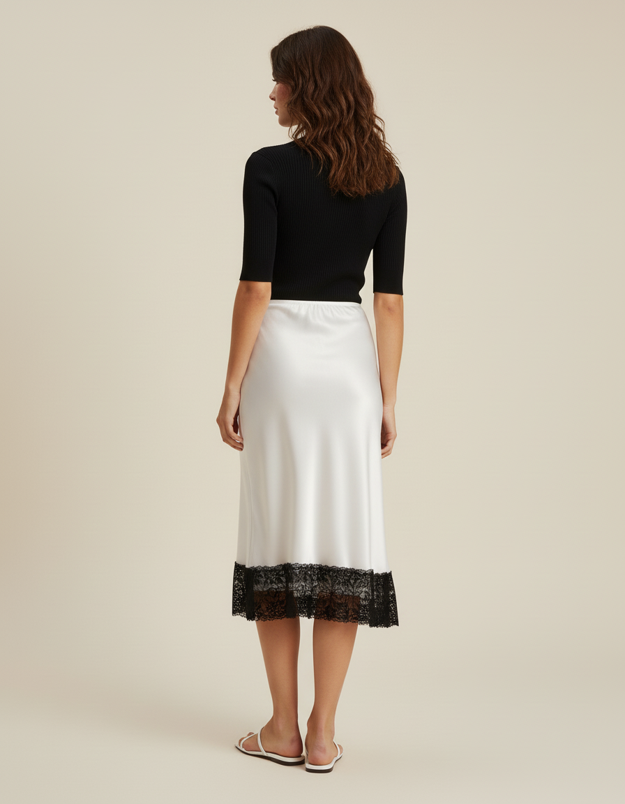 Jupe Dentelle Blanche Satin Élégante : Jupe midi avec bordure en dentelle