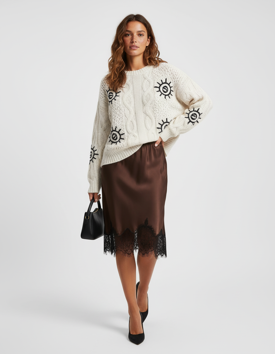 Ce qui la distingue ? L'alliance audacieuse d'un marron satiné riche et d'une délicate bordure en dentelle noire, qui ajoute une touche de sensualité raffinée sans jamais être ostentatoire. Plus qu'une simple jupe, c'est une invitation à mixer les textures et les styles : associez-la à un pull en maille chunky pour un look 'hygge' sophistiqué, ou à un chemisier en soie pour une élégance intemporelle. La 'Jupe Dentelle Marron Satinée' est la promesse d'une garde-robe où luxe moderne rime avec praticité et distinction.