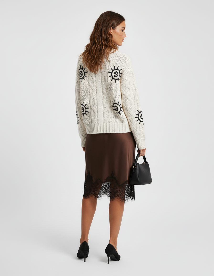 La 'Jupe Dentelle Marron Satinée Élégante Chaleureuse' est la pièce maîtresse d'une garde-robe raffinée, parfaitement adaptée aux soirées chics. Pour une allure décontractée et sophistiquée, associez-la à un pull en maille torsadée dans des tons crème, comme suggéré, et des escarpins pour un contraste de textures irrésistible. Pour une occasion plus formelle, mariez-la à un chemisier en soie fluide ou un top bustier et une veste structurée. Sa teinte marron profonde et sa dentelle délicate en font un caméléon de l'élégance, prête à s'adapter à toutes vos envies avec distinction.