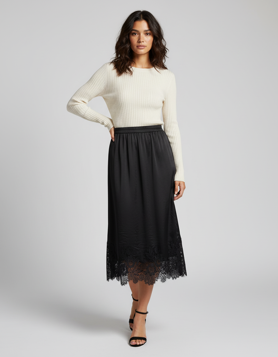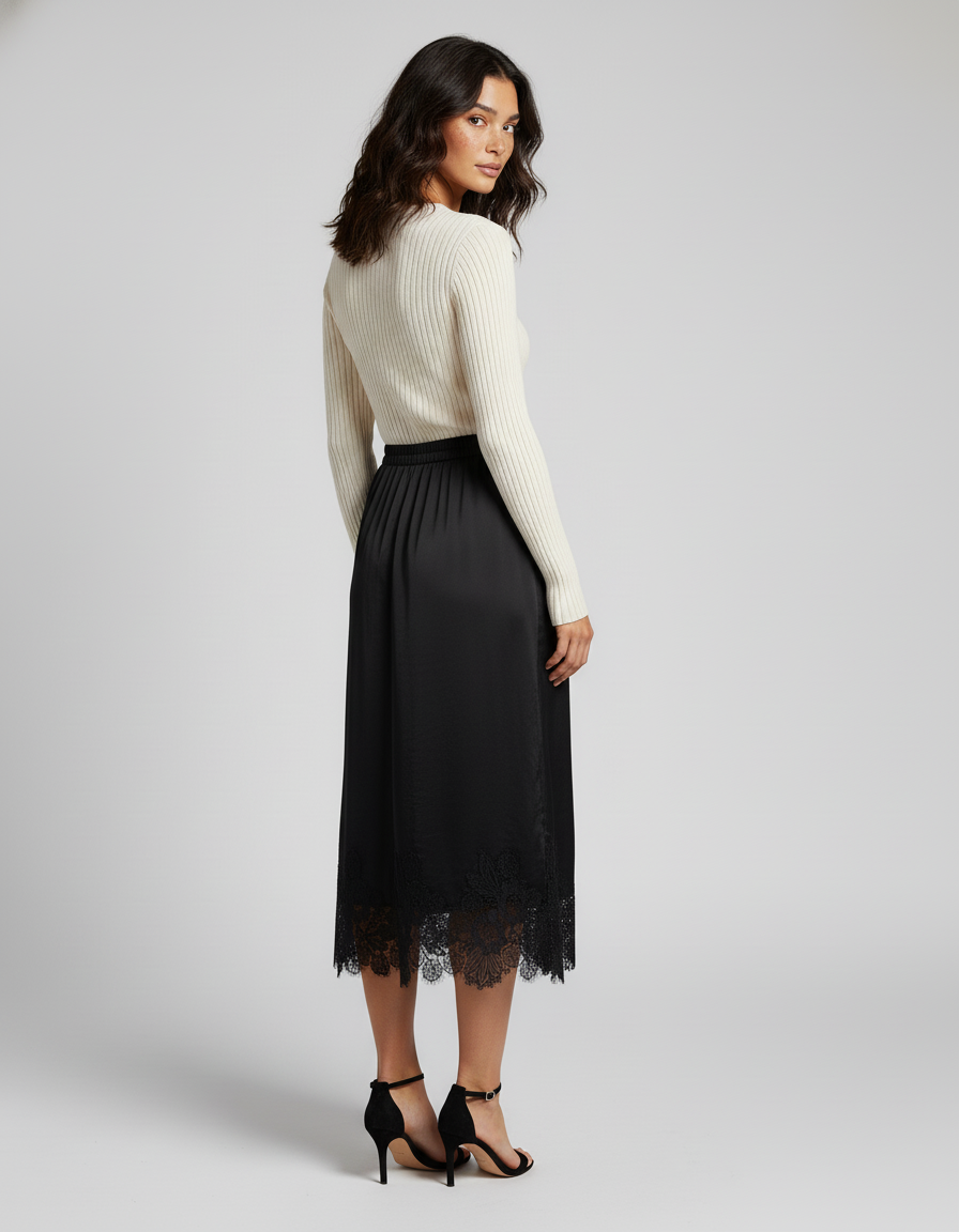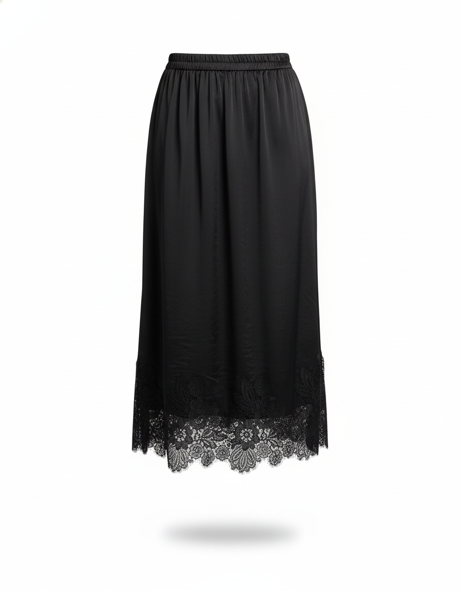 Adoptez l'élégance intemporelle avec cette jupe midi en satin noir, ornée d'une délicate dentelle.