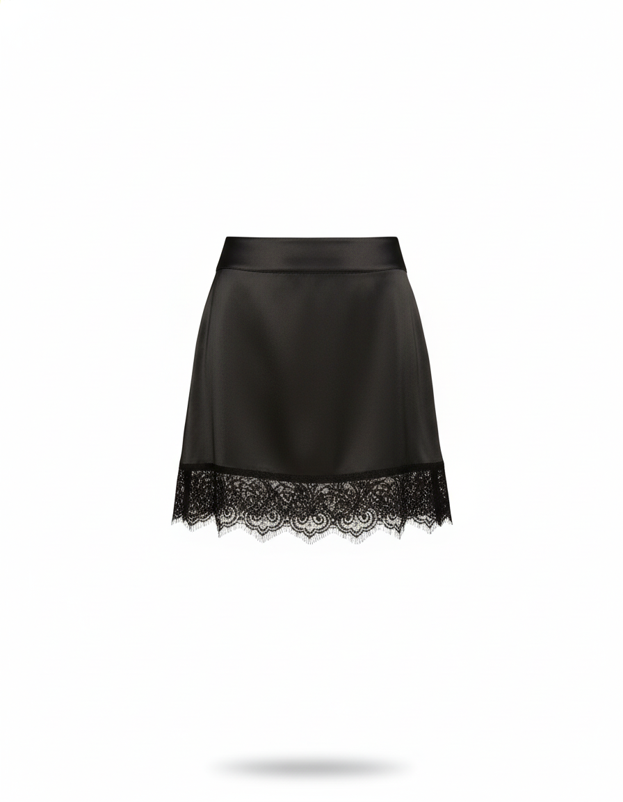 Adoptez un look sophistiqué et intemporel avec notre jupe en satin noir rehaussée de dentelle.