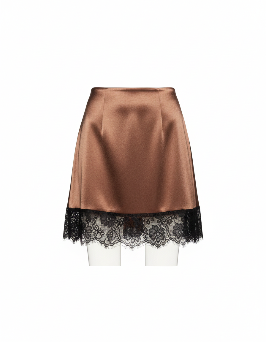 Conçue dans un satin marron somptueux et rehaussée d'une dentelle délicate, cette jupe trapèze mini incarne l'élégance moderne. Son tombé fluide épouse gracieusement la silhouette sans jamais entraver vos mouvements, vous offrant une liberté totale. Profitez d'un confort inégalé, que vous dansiez toute la nuit ou flâniez en ville, grâce à sa conception pensée pour votre bien-être.