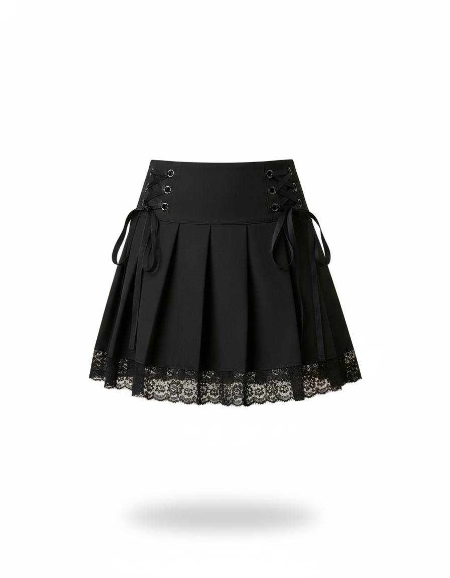 Cette jupe plissée est de couleur noire et présente des laçages décoratifs sur la ceinture. Le bas de la jupe est orné d'une bordure en dentelle.